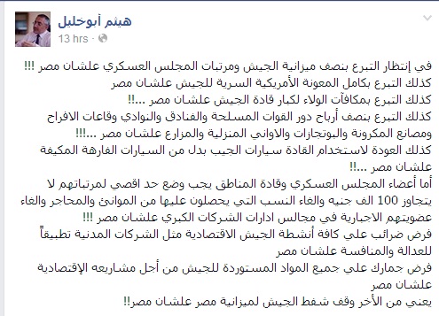 وقال أبو خليل فى تدوينة عبر صفحته عل "فيس بوك": في انتظار التبرع بنصف ميزانية الجيش ومرتبات المجلس العسكري علشان مصر!!، كذلك التبرع بكامل المعونة الأمريكية السرية للجيش علشان مصر، كذلك التبرع بمكافآت الولاء لكبار قادة الجيش علشان مصر.!!، كذلك التبرع بنصف أرباح دور القوات المسلحة والفنادق والنوادي وقاعات الأفراح ومصانع المكرونة والبوتجازات والاواني المنزلية والمزارع علشان مصر، كذلك العودة لاستخدام القادة سيارات الجيب بدل من السيارات الفارهة المكيفة علشان مصر".
