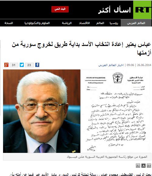 واعتبر عباس في رسالته التي نشرتها قناة روسيا اليوم أن اعادة انتخاب الرئيس السوري بشار الأسد هو "بدء العد العكسي" لخروج سورية من أزمتها "بمواجهة الإرهاب" المستمر منذ أكثر من ثلاثة سنوات.