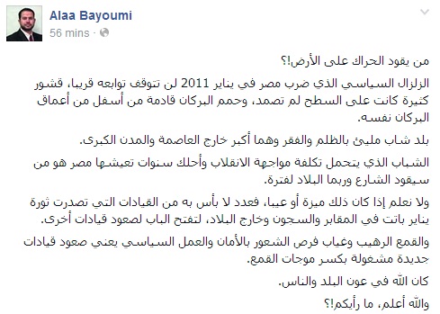 قال علاء بيومي، الناشط السياسي، إن الزلزال السياسي الذي ضرب مصر في يناير 2011 لن تتوقف توابعه قريبا، "قشور كثيرة كانت على السطح لم تصمد، وحمم البركان قادمة من أسفل من أعماق البركان نفسه".