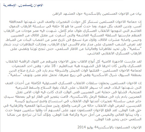 استنكرت جماعة الإخوان المسلمين بالإسكندرية، كل حوادث التفجيرات والعنف التي شهدتها المحافظة أمس، مضيفة أنها تدين العنف بكل صوره، وما حدث أمس ما هو إلا حلقة في سلسلة الإرهاب الدموي الغاشم التي انتهجها الانقلاب العسكري طوال عام كامل، شهدت فيه مصر موجات من الإرهاب المنظم مارستها السلطة العسكرية الغاشمة والتى أسفرت عن مقتل الآلاف من المصريين وحبس وإصابة عشرات الآلاف، ولأول مرة نسمع فى تاربخ مصر عن اغتصاب البنات من الضباط.