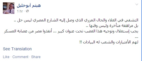 وأضاف أبو خليل فى تدوينة عبر صفحته على "فيس بوك":"يجب استغلال وتوجيه هذا الغضب تحت عنوان كبير … أنقذوا مصر من عصابة العسكر … لهم الامتيازات والشعب له البيادات !!".