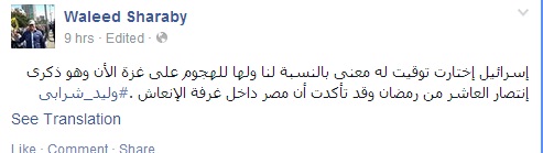 وأضاف شرابي في تدوينة عبر صفحته على موقع التواصل الاجتماعي "فيس بوك": "إسرائيل اختارت توقيتا له معنى بالنسبة لنا ولها للهجوم على غزة الآن، وهو ذكرى انتصار العاشر من رمضان وقد تأكدت أن مصر داخل غرفة الإنعاش".