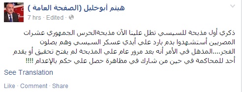 وقال أبو خليل في تدوينة عبر صفحته على موقع التواصل الاجتماعي "فيس بوك": "ذكري أول مذبحة للسيسي تطل علينا الآن مذبحة الحرس الجمهوري عشرات المصريين استشهدوا بدم بارد على أيدي عسكر السيسي وهم يصلون الفجر….المذهل في الأمر أنه بعد مرور عام علي المذبحة لم يفتح تحقيق أو يقدم أحد للمحاكمة في حين من شارك في مظاهرة حصل علي حكم بالإعدام !!!!"