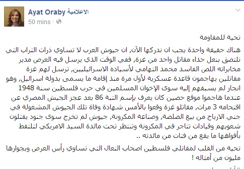 واختتمت: تحية من القلب لمقاتلي فلسطين أصحاب النعال التي تساوي رأس العر* وبجوارها مليون من أمثاله!".