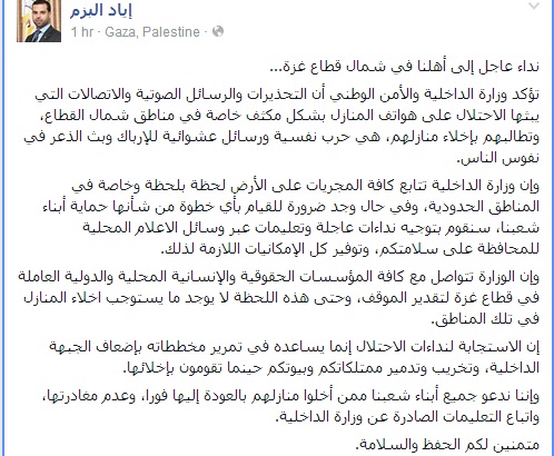 أكدت وزارة الداخلية والأمن الوطني الفلسطينية، أن التحذيرات والرسائل الصوتية والاتصالات التي يبثها الاحتلال على هواتف المنازل بشكل مكثف خاصة في مناطق شمال القطاع، وتطالبهم بإخلاء منازلهم، هي حرب نفسية ورسائل عشوائية للإرباك وبث الذعر في نفوس الناس.