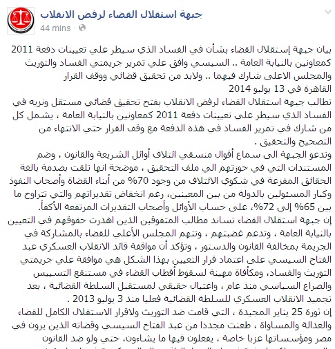 وأعلنت الجبهة مساندتها لمطالب المتفوقين الذين أهدرت حقوقهم في التعيين بالنيابة العامة ، وتدعم غضبتهم ، وتتهم المجلس الأعلي للقضاء بالمشاركة في الجريمة بمخالفة القانون والدستور ، مؤكدة أن موافقة قائد الانقلاب العسكري عبد الفتاح السيسي على اعتماد قرار التعيين بهذا الشكل هي موافقة علي جريمتي التوريث والفساد، ومكأفاة مهينة لسقوط أقطاب القضاء في مستنقع التسييس والصراع السياسي منذ عام ، واغتيال حقيقي لمستقبل السلطة القضائية ، بعد تجميد الانقلاب العسكري للسلطة القضائية فعليا منذ 3 يوليو 2013 .