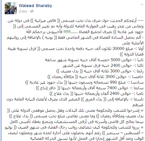وقال فى تدوينة عبر صفحته على "فيس بوك" نقلا عن المستشار أيمن الوردانى:"أزعجكم الحديث حول صرف بدل تحت مسمى (( فائض ميزانية )) فى دولة تئن وتعانى من عجز رهيب فى الموازنة العامة للدولة وأنه تم تغيير المسمى إلى (( جهود غير عادية )) تصرف لجميع القضاة ……!!!!!! فأجيبونى يرحمكم الله".