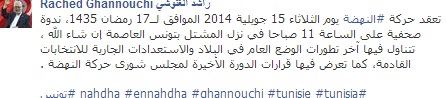 وقال الشيخ راشد الغنوشى زعيم الحركة فى تدوينة عبر صفحته الرسمية على "فيس بوك" أن الندوة سوف تستعرض قرارات الدورة الأخيرة لمجلس شورى حركة النهضة .