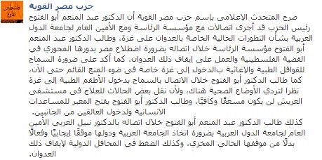 وأكد المتحدث باسم حزب مصر القوية أن هذا العمل لا يصدر إلا عن مجرمين لا يريدون الخير لمصر ويريدون صرف الأنظار عن جرائم إسرائيل في غزة ويريدون الوقيعة بين الشعبين المصري والفسلطيني، وطالب الجهات الأمنية بسرعة الكشف عن الجناة الحقيقيين وتقديمهم لمحاكمة عاجلة.