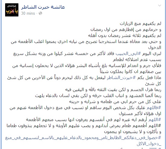 وقال عائشة فى تدوينة عبر صفحتها على موقع التواصل الاجتماعي "فيس بوك": "لم يكفيهم منع الزيارات و حرمانهم من إفطارهم من أول رمضان لم يكفيهم ثلاثة عشر رمضان بدون أهله و حتي بعد معاناة عندما استخرجنا تصريح من نيابة أخري يمنعوا اغلب الأطعمة من الدخول لنري اليوم أبي الحبيب فاقد لأكثر من خمسة عشر كيلو من وزنه بشكل سريع بسبب عدم امتلاكه لطعام ".