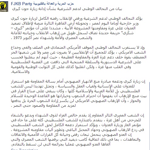 وأضاف التحالف أن زيارة كيري ودعمه مبادرة منع الانهيار الصهيوني أمام بسالة المقاومة هو استمرار للعدوان علي الإنسانية ولغياب العقل والسياسة ، وتمثل تهديدا ليس للشعب الفلسطيني بل للأمة العربية والإسلامية كلها ، وكان ينبغي على صناع القرار في بيت صنع الإرهاب أن يفهموا أن احترام الشعوب وخياراتها هو القاعدة الوحيدة للسلام والحوار ، وأن الإرهاب الصهيوني الأمريكي لن يكسر إرادة الشعوب الحرة بل يدفعها لمزيد من المقاومة والصمود حتي النصر .