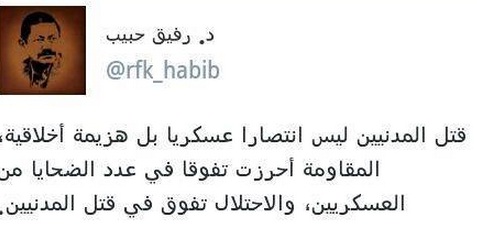 وأضف حبيب فى تغريدة عبر صفحته على موقع التواصل الاجتماعي "تويتر" :المقاومة أحرزت تفوقا فى عدد الضحايا من العسكريين والاحتلال تفوق فى قتل المدنيين".