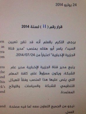 أصدر مدير شبكة الجزيرة قرارًا بتعيين الصحفي ياسر أبو هلالة مديرًا لقناة الجزيرة الإخبارية. وكان أبو هلالة الأردني الجنسية يشغل منصب مدير مكتب الجزيرة في عمان لسنوات، ويعتبر من أبرز الصحفيين في القناة حيث عمل مراسلًا صحفيًا غطى أهم الأحداث في العرق ولبنان وغزة.