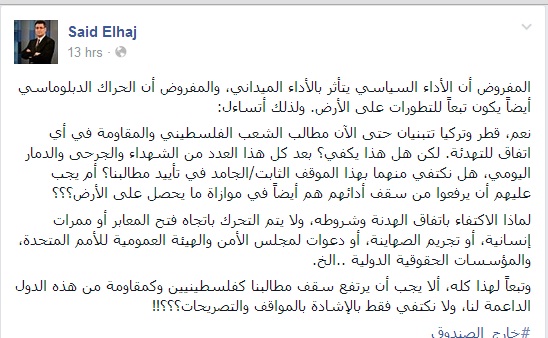 وتساءل الحاج: نعم، قطر وتركيا تتبنيان حتى الآن مطالب الشعب الفلسطيني والمقاومة في أي اتفاق للتهدئة. لكن هل هذا يكفي؟ بعد كل هذا العدد من الشهداء والجرحى والدمار اليومي، هل نكتفي منهما بهذا الموقف الثابت/الجامد في تأييد مطالبنا؟ أم يجب عليهم أن يرفعوا من سقف أدائهم هم أيضاً في موازاة ما يحصل على الأرض؟؟؟.