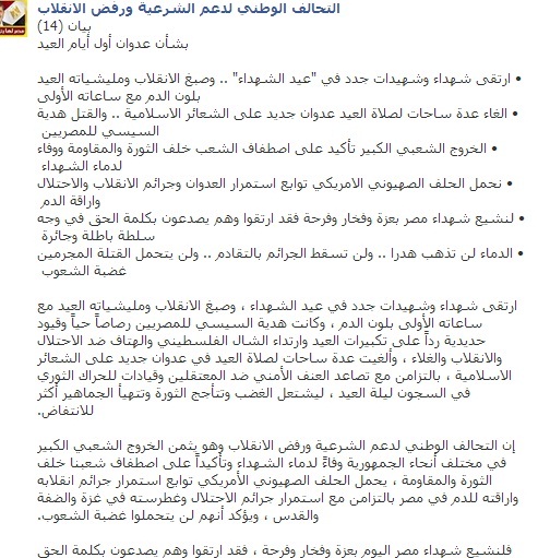 وأضاف التحالف: "فلنشيع شهداء مصر اليوم بعزة وفخار وفرحة ، فقد ارتقوا وهم يصدعون بكلمة الحق في وجه سلطة باطلة وجائرة ، ودماءهم لن تذهب هدراً ولن تسقط جرائم القتلة المجرمين بالتقادم ، والشعب المصري الثائر ماضي في طريق المقاومة الشعبية السلمية حتى اسقاط الانقلاب وإفشال المخطط الصهيوني الأمريكي لتنتصر الثورة ويتحقق القصاص ، وعلى الباغي ستدور الدوائر".