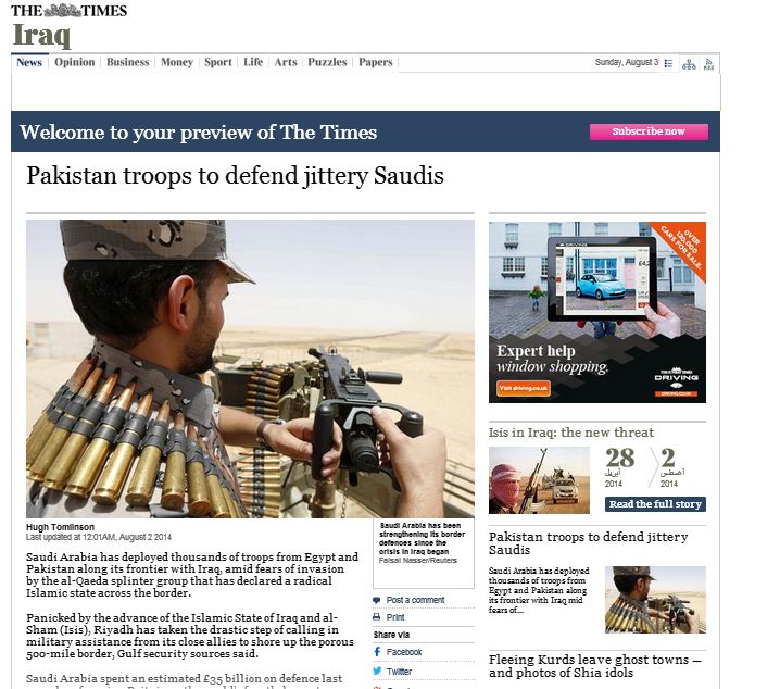 كشفت جريدة التايمز البريطانية أن السعودية نشرت فعلا آلاف الجنود من الجيش المصري والباكستانيين والمصريين على حدودها مع العراق لحمايتها مستقبلا من هجمات جماعة الدولة الإسلامية التي تسعى للسيطرةعلى بلاد الحجاز بعد سيطرتها علي العراق وسوريا.