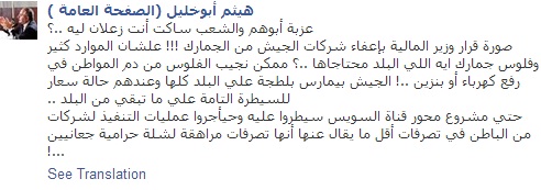 وقال أبو خليل فى تدوينة عبر صفحته على موقع التواصل الاجتماعي "فيس بوك": "علشان الموارد كثير وفلوس جمارك ايه اللي البلد محتاجاها ..؟ ممكن نجيب الفلوس من دم المواطن في رفع كهرباء أو بنزين".