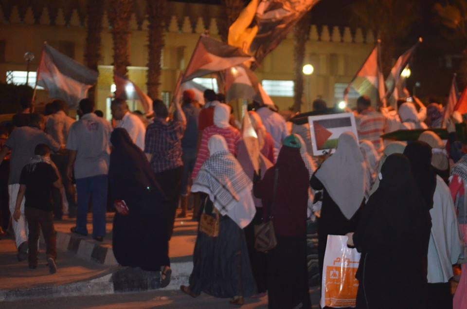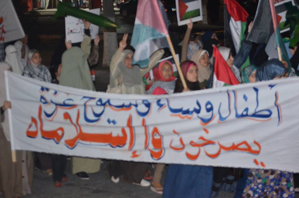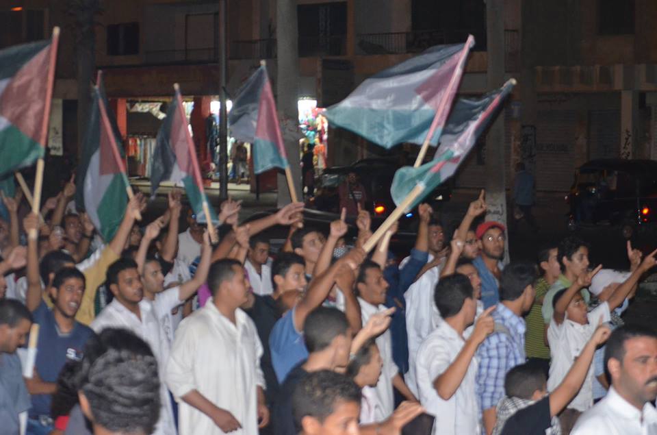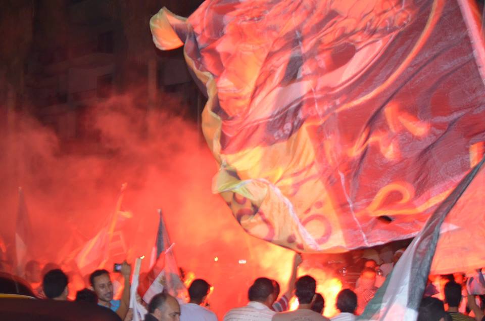 نظم أهالى "برج العرب" في محافظة "الأسكندرية"، تظاهرة تضامنية مع الشعب الفلسطيني وأهالي "غزة"، مساء أمس الثلاثاء، رفع المشاركون خلالها أعلام "فلسطين"، وشارات "رابعة"، وكذلك أعلام "الأولتراس".