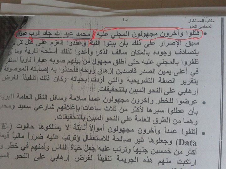 كما أن هذا الشخص هو نفسه المتهم الرئيسي في قتل الشهيدين حسام الدين عبد الرحيم و محمد عبد الله جاد كما هو مثبت في القضيتين (قتل 5127 لسنة 2013 إداري ثان طنطا ، قتل 5131 لسنة 2013 إداري ثان طنطا).