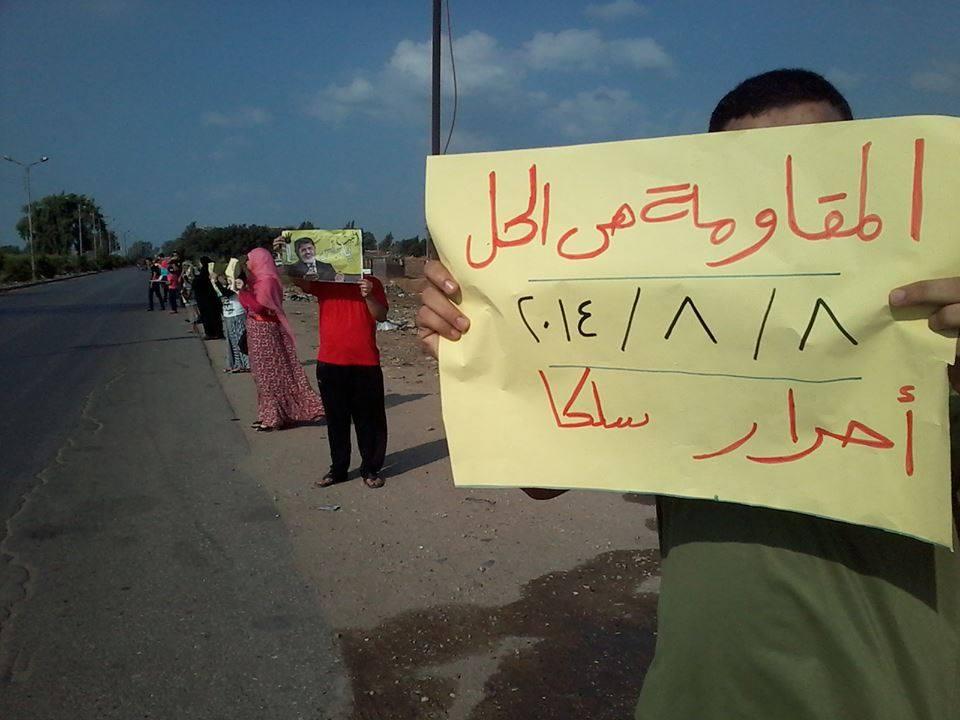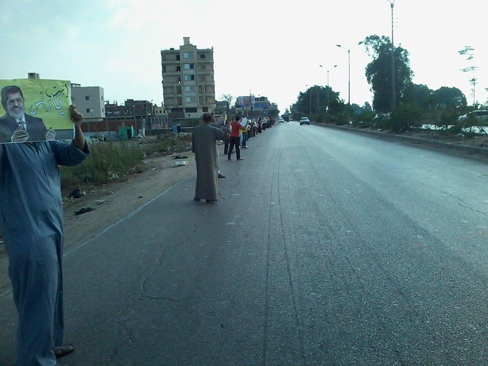 ‫كما نظم رفضوا حكم العسكر، في "المنصورة"، سلسلة بشرية على طريق"محلة دمنة – المنصورة"، رفع المشاركون خلالها صور الرئيس الشرعي الدكتور "محمد مرسي"،  وأعلام "مصر"، رافعين لافتات تندد بالموقف المصري المتخاذل تجاه ما يحدث بـ"غزة".