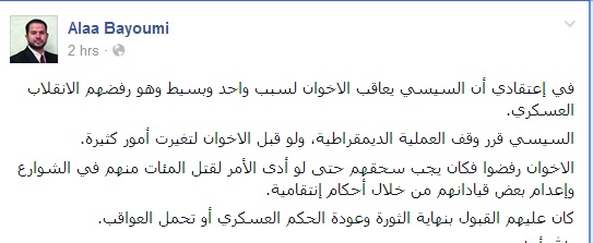 وقال في تدوينة عبر صفحته على موقع التواصل الاجتماعي "فيس بوك": "في اعتقادي أن السيسي يعاقب الإخوان لسبب واحد وبسيط وهو رفضهم الانقلاب العسكري"، مضيفا أن "السيسي قرر وقف العملية الديمقراطية، ولو قبل الإخوان لتغيرت أمور كثيرة".