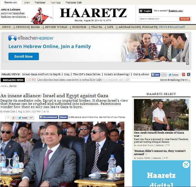كشفت كبرى الصحف الإسرائيلية "هآرتس" أن التحاف الحالي بين مصر وإسرائيل أصبح "تحالف جنوني" وأن مصر وإسرائيل أصبحا تتأمران مع بعضهما ضد حركة حماس وحركات المقاومة الفلسطينية بشكل واضح .