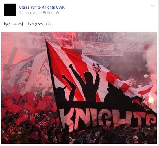نشرت رابطة جماهير نادى الزمالك "وايت نايتس" منشورًا على صفحتها على موقع التواصل الاجتماعي "فيس بوك" يفيد بتنظيمها لتظاهرات، غدًا الأربعاء، رفضًا لسياسات مجلس إدارة نادي الزمالك برئاسة المستشار مرتضى منصور.
