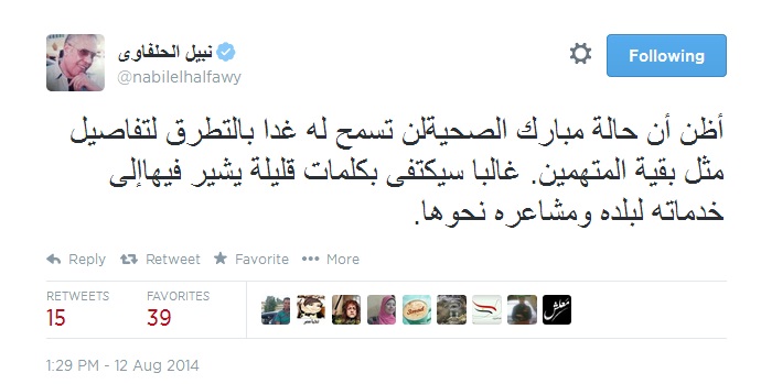 وقال "الحلفاوي" في تغريدته: "أظن أن حالة مبارك الصحية لن تسمح له غدًا بالتطرق لتفاصيل مثل بقية المتهمين. غالبًا سيكتفي بكلمات قليلة يشير فيها إلى خدماته لبلده ومشاعره نحوها".