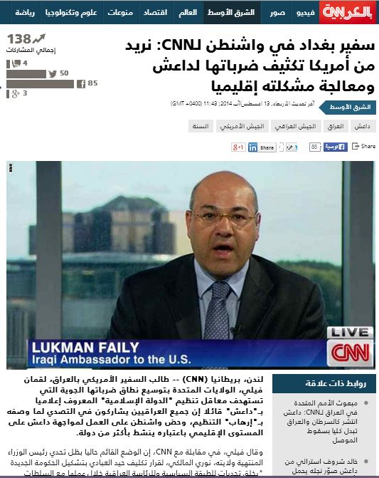 طالب السفير العراقي بالولايات المتحدة الأمريكية، "لقمان فيلي"، في لقاء له مع شبكة "CNN" الإخبارية الأمريكية؛ الولايات المتحدة بتوسيع نطاق ضرباتها الجوية التي تستهدف الأماكن التي يسيطر عليها تنظيم "الدولة الإسلامية" في العراق.