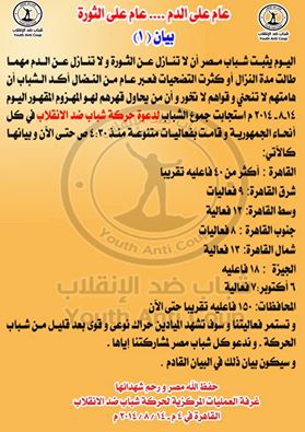 أصدرت حركة "شباب ضد الانقلاب"، بياناً بالفعاليات التي قام بها شباب الحركة في "القاهرة"، اليوم الخميس، في بيان رقم 1 بعنوان " عام علي الدم .. عام علي الثورة" .