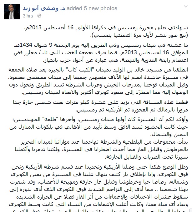 وقال أبوزيد في تدوينة عبر صفحته على موقع التواصل الاجتماعي "فيس بوك": "ما عشته في ميدان رمسيس وفي الطريق إليه يوم الجمعة 9 شوال 1434هـ الموافق 16 أغسطس 2013م، فيما عرف بجمعة الغضب التي تلتْ مجازر فض اعتصام رابعة العدوية والنهضة، هي عبارة عن أجواء حرب بامتياز".