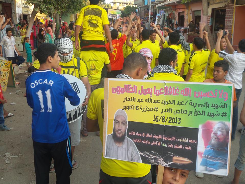 نظم ألترس "ربعاوي" في "بني سلامة" بـ"الجيزة"، مسيرة حاشدة، إحياءاً لذكرى استشهاد "عبدالحميد عبدالله عبدالغفار"، والذي استشهد أثناء مشاركته في تظاهرات مناهضة للانقلاب في مدينة"السادس من أكتوبر"، في 16/8 من العام الماضي .