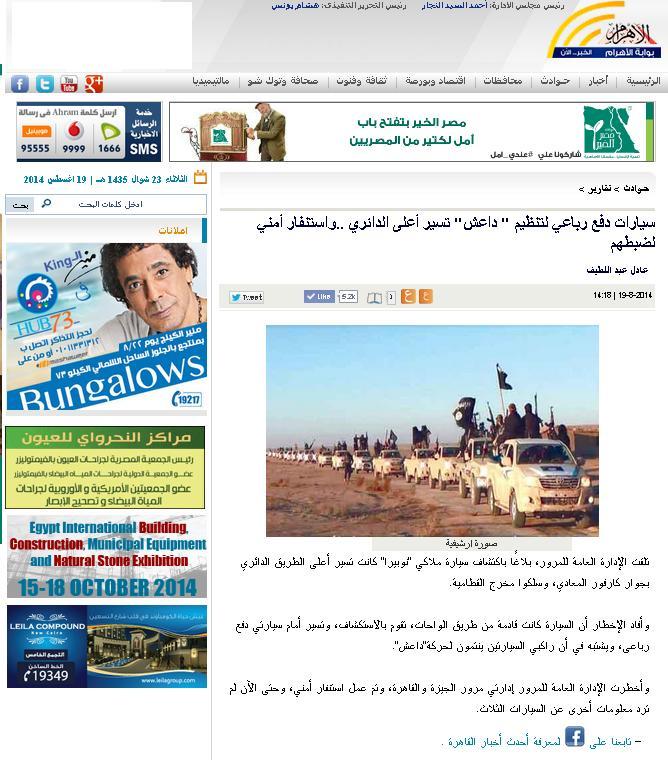 نشرت جريدة "الأهرام" الحكومية، منذ قليل، خبر بعنوان "سيارات دفع رباعي لتنظيم "داعش تسير أعلى الدائري .....
