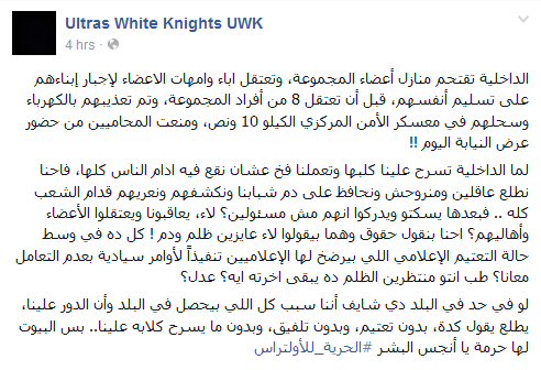 صرح "وايت نايتس"، أولتراس مشجعي نادي الزمالك، أن قوات أمن الانقلاب اقتحمت عددًا من منازل أعضاء المجموعة، وقامت باعتقال أباء وأمهات الأعضاء، لإجبارهم على تسليم أنفسهم.