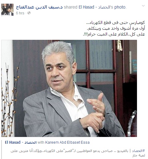 وقال عبد الفتاح في تدوينة عبر صفحته على موقع التواصل الاجتماعي "فيس بوك": "أول مرة أشوف واحد ميت وبيتكلم، على كلٍ..الكلام على الميت حرام!!!".