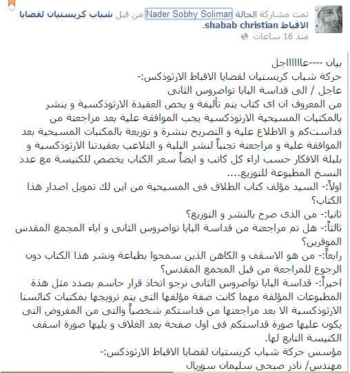 وطالب سليمان في بيان له، مساء أمس، على الصفحة الرسمية للحركة على موقع التواصل الاجتماعي "فيس بوك" البابا تواضروس، باتخاذ موقف حاسم تجاه المؤلفات التي لم يتم مراجعتها من قبل أساقفة المجمع المقدس، قائلا: "قداسة البابا تواضروس الثاني نرجو اتخاذ قرار حاسم بصدد مثل هذه المطبوعات المؤلفة مهما كانت صفة مؤلفها، التي يتم ترويجها بمكتبات كنائسنا الأرثوذكسية إلا بعد مراجعتها من قداستكم شخصياً، والتي من المفروض أن يكون عليها صورة قداستكم في أول صفحة بعد الغلاف و يليها صورة أسقف الكنيسة التابع لها."