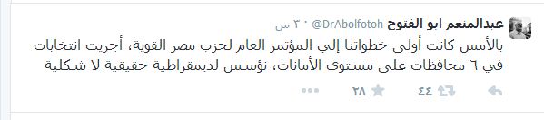 أكد الدكتور عبد المنعم أبو الفتوح، رئيس حزب مصر القوية، فى تغريدة عبر حسابه على موقع التواصل الاجتماعى "تويتر"، أن أمس الجمعة، شهد أولى الخطوات إلى المؤتمر العام لحزب مصر القوية".