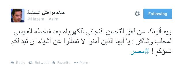 ففي تغريدة له على موقع التدوينات القصيرة “تويتر”، قال “عبد العظيم”: “ويسألونك عن لغز التحسن الفجائي للكهرباء بعد شخطة السيسي لمحلب وشاكر.. يا أيها الذين آمنوا لا تسألوا عن أشياء إن تبد لكم تسؤكم”.