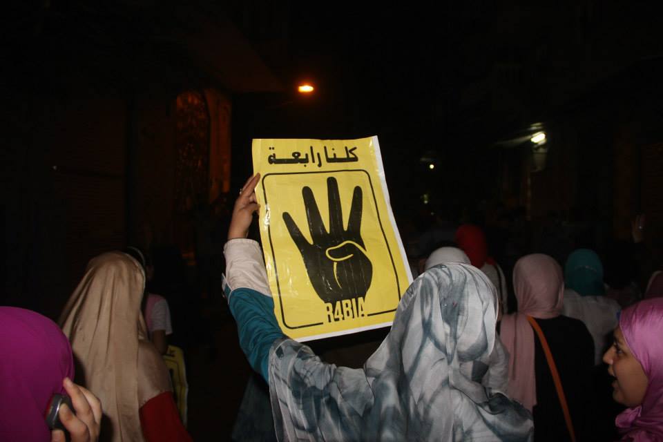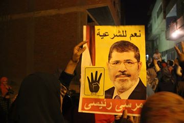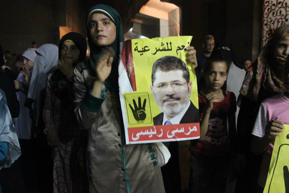 لوح المشاركون بشارات رابعة، وحملوا صورًا للرئيس الشرعي محمد مرسي، هاتفين بـ"وحياة دمك يا شهيد.. ثورة تاني من جديد".