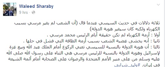 وأضاف شرابى فى تدوينة عبر صفحته على فيس بوك: ثلاثة دلالات في حديث السيسي عندما قال (أن الشعب لم يغير مرسي بسبب الكهرباء ولكنه كان سيغير هوية الدولة).