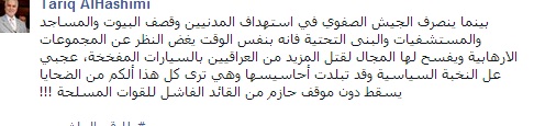 وأضاف الهاشمى فى تدوينة عبر صفحته على فيس بوك: "بينما ينصرف الجيش الصفوي في استهداف المدنيين وقصف البيوت والمساجد والمستشفيات والبني التحتية فانه بنفس الوقت يغض النظر عن المجموعات الإرهابية ويفسح لها المجال لقتل المزيد من العراقيين بالسيارات المفخخة".