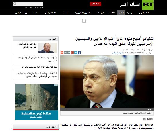 نقلت قناة روسيا اليوم أراء الصحف والإعلاميين الإسرائيليين الغاضبة من قرار وقف إطلاق النار المتبادل، ورضوخ رئيس الوزراء الصهيوني "بنيامين نتنياهو" لشروط المقاومة وفشله في إسقاط حركة حماس واحتلال غزة أو تحجيم قدرتهم الصاروخية.