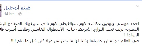 وقال أبو خليل في تدوينة عبر صفحته على موقع التواصل الاجتماعي "فيس بوك": "أحمد موسى، وتوفيق عكاشة كوم …والغيطي كوم تاني …بيقولك الضفادع البشرية المصرية نزلت تحت البوارج الأمريكية بتاعة الأسطول الخامس وطلعت أسرت قائد القوات!!!".