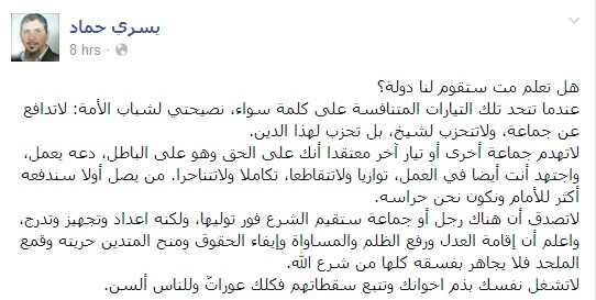 وقال حماد فى تدوينة عبر صفحته على "فيس بوك" :"عندما تتحد تلك التيارات المتنافسة على كلمة سواء، نصيحتي لشباب الأمة: لا تدافع عن جماعة، ولا تتحزب لشيخ، بل تحزب لهذا الدين".