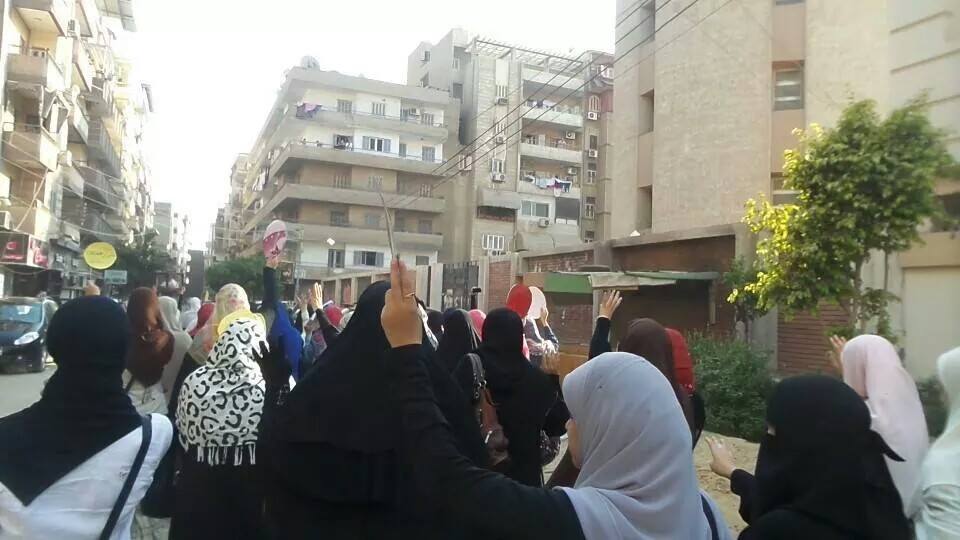 نظمت حركة "حورية المنصورة" اليوم مسيرة بـ "المنصورة" رفعوا خلالها شارات رابعة، وصور فتيات المنصورة الثلاث "منة...