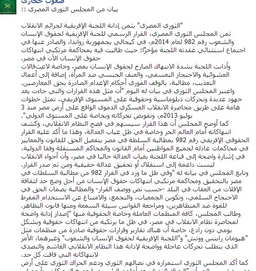ثمن المجلس الثوري المصري، القرار الرسمي للجنة الإفريقية لحقوق الإنسان والشعوب رقم 982 لعام 2014م، في كيجالي بجمهورية رواندا، والصادر عنها في اجتماع استثنائي عقدته اللجنة مؤخرًا؛ حيث طالبت فيه بمحاكمة مرتكبي انتهاكات حقوق الإنسان الآن في مصر.