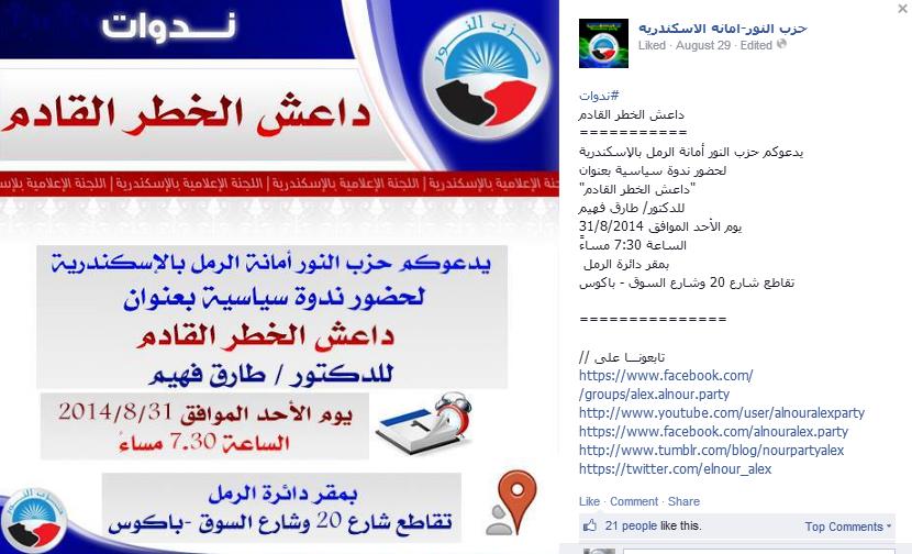 وقالت الصفحة الرسمية لحزب النور :"يدعوكم حزب النور أمانة الرمل بالأسكندرية لحضور ندوة سياسية بعنوان "داعش الخطر القادم" للدكتور/ طارق فهيم يوم الأحد الموافق 31/8/2014 الساعة 7:30 مساءً بمقر دائرة الرمل تقاطع شارع 20 وشارع السوق – باكوس".