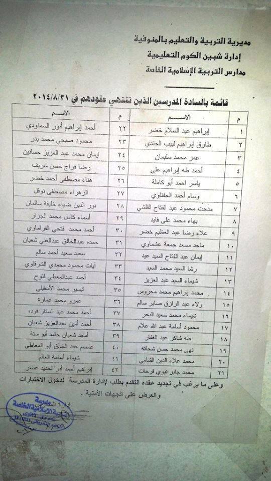 أصدرت إدراة شبين الكوم التعليمية، التابعة لمدرية التربية والتعليم بمحاظفة المنوفية، قرارًا بإيقاف 42 معلمًا ومعلمة بمدرسة التربية الإسلامية، عن العمل، بدءً من اليوم الأحد.