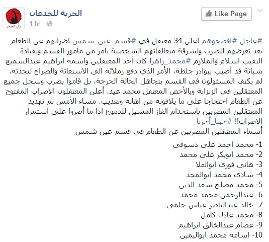 أعلن 34 معتقلا في قسم عين شمس إضرابهم عن الطعام بعد تعرضهم للضرب ولسرقة متعلقاتهم الشخصية بأمر من مأمور القسم وبقيادة النقيب إسلام والملازم محمد زاهر.
