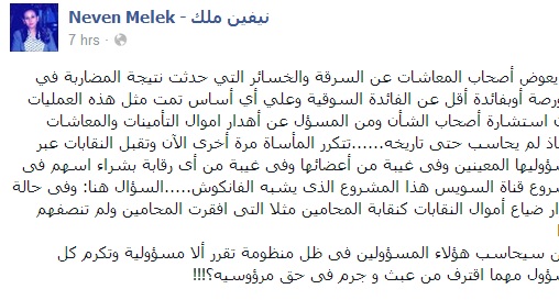 وأضافت فى تدوينة عبر صفحته على "فيس بوك": تتكرر المأساة مرة أخرى الآن وتقبل النقابات عبر مسؤوليها المعينين وفى غيبة من أعضائها وفى غيبة من أى رقابة بشراء أسهم فى مشروع قناة السويس هذا المشروع الذى يشبه الفانكوش".